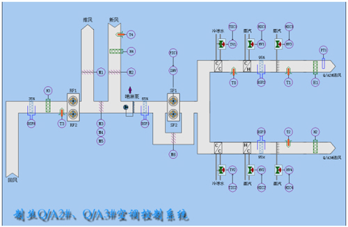 在上位監(jiān)控微機(jī)上顯示中央空調(diào)的整個(gè)工作狀態(tài),如工藝流程圖、動(dòng)畫(huà)構(gòu)件、空氣流動(dòng)塊、過(guò)程參數(shù)、安紐設(shè)置。