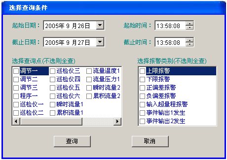 (3)報(bào)警:變頻器、溫度、濕度、風(fēng)壓發(fā)生異常報(bào)警時(shí),相應(yīng)的顯示會(huì)發(fā)生閃爍及聲音報(bào)警點(diǎn)擊消除;同時(shí)選擇各類(lèi)報(bào)警并記錄報(bào)表;提供打印功能。