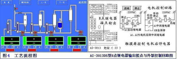 在流程圖中可操作按鈕;控制按鈕連接AI-3013D5開關量8路繼電器輸出模塊,地址設33號,圖中開關按鈕可控制4臺電機啟停;連接AI-3011D5開關量8個輸入干接點,地址37號,顯示設備運行狀態(tài);點擊圖中的數據框:【TIC-101】回到【單條曲線】通道。