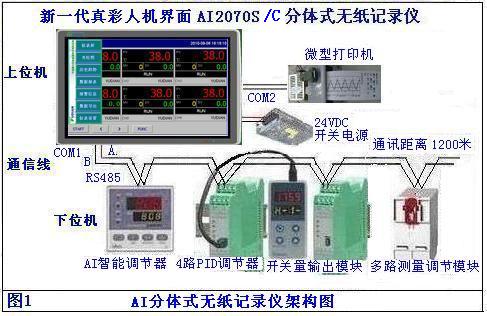 1、上位機:新一代真彩人機界面AI-2070S/C分體式無紙記錄儀,使用宇電AI系列調節(jié)儀表作為測控輸入模塊實現多通道數字全屏顯示。測控儀表不僅包括各類溫度、壓力、等信號,也包括人工智能PID調節(jié)、可按需要配置,任意組合;