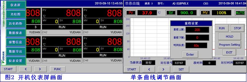 新一代真彩人機界面AI-2070S/C分體式無紙記錄儀,通過RS485通訊接口,能方便地與AI智能程序型PID溫度調節(jié)器配合使用。在電爐程序控溫時在人機觸摸屏上可顯示雙曲線運行圖;