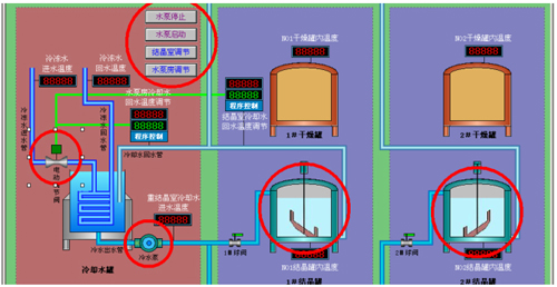 上圖是某結(jié)晶罐的結(jié)晶控制系統(tǒng),在該系統(tǒng)中(紅色框部分)使用了一臺(tái)AI-301ME5L5L5L4I5I5用了9個(gè)I/O點(diǎn),4個(gè)輸出點(diǎn)用于手動(dòng)控制水泵的啟停和水溫調(diào)節(jié)的方式,5個(gè)輸入點(diǎn)用于采集顯示攪拌電機(jī)旋轉(zhuǎn)、冷水泵動(dòng)作及調(diào)節(jié)閥的狀態(tài)用動(dòng)畫來(lái)顯示。