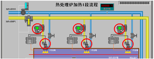 該熱處理加熱監(jiān)控系統(tǒng)使用了4臺(tái)AI-301ME5I5I5I5I5I5共37個(gè)I/O點(diǎn),主要控制和檢測(cè)冷卻風(fēng)機(jī),加熱器,煤氣噴嘴電磁閥,進(jìn)水電磁閥,煤氣濃度報(bào)警器等多個(gè)開關(guān)量輸入輸出設(shè)備。