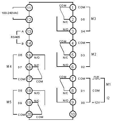 AI-301M有6個(gè)模塊插座,你可以按照不同功能選擇模塊實(shí)現(xiàn)對(duì)開關(guān)量信號(hào)輸入輸出的功能。其中COMM(RS485)專用于安裝通訊模塊與計(jì)算機(jī)通訊;其他M1、M2、M3、M4、M5都可以安裝2路開關(guān)量輸入或1/2路繼電器輸出模塊,其中M1還可以安裝I2頻率輸入模塊。